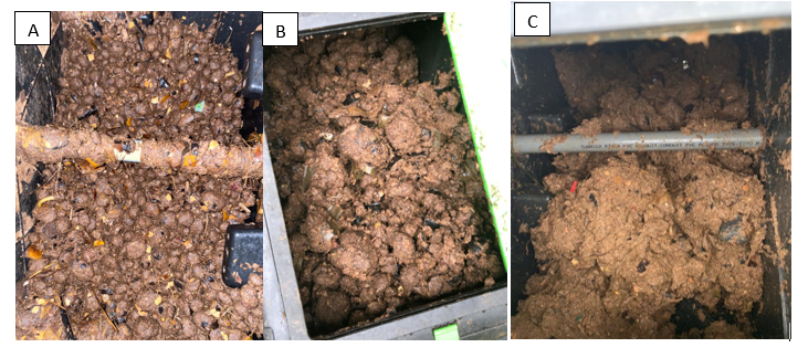 Figura 2. Exceso de humedad dentro de la compostera. A. humedad alta, evideneciada por el apelotamiento del material. B. El exceso de humedad genera pelotas más grandes y una estructura gruesa y moldeable dentro de la compostera. C. Estado crítico de humedad donde se ha formado una aglomeración del material.