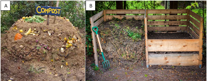 Figura 4. Pilas de compost A) en montañitas B) En cajones.